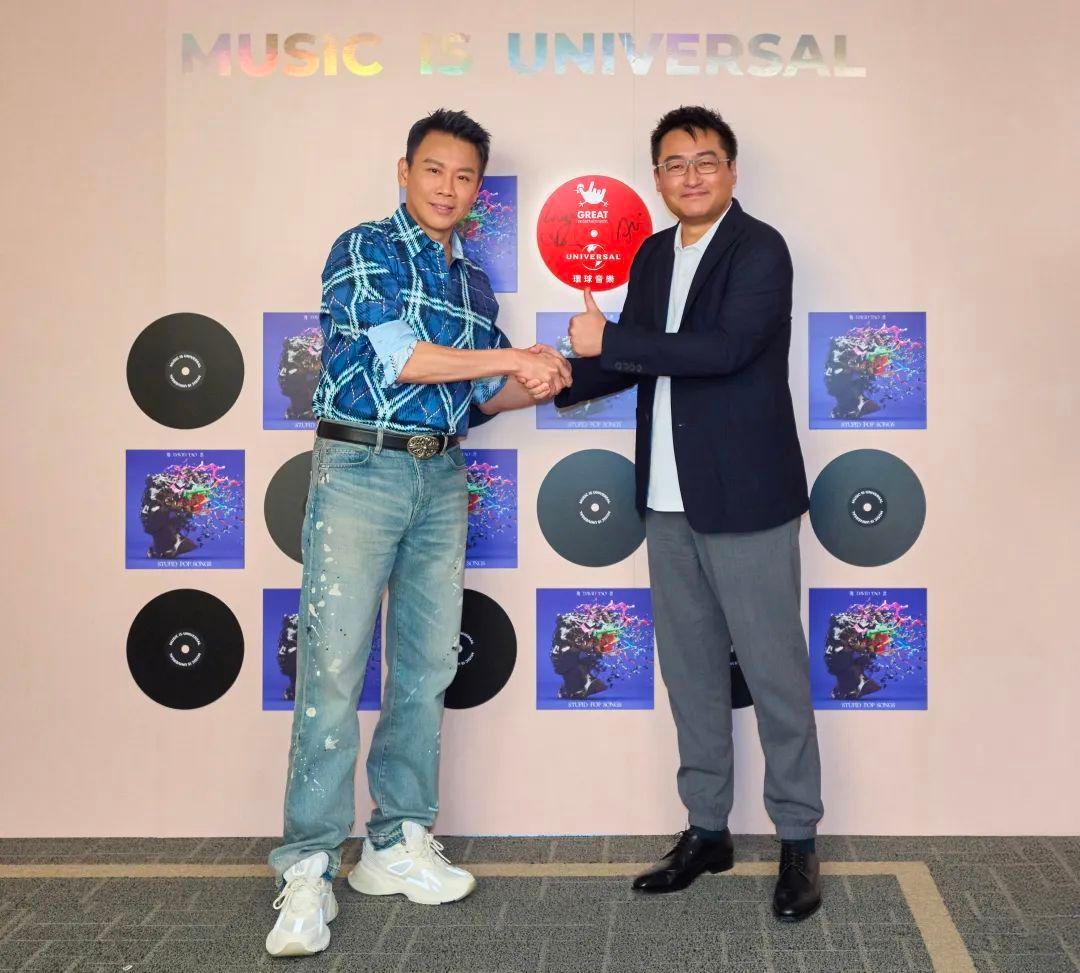 (环球音乐大中华区主席暨首席施行官徐毅与陶喆一同在秀雅合营的黑胶唱盘上签名,标志着双清廉式签订战术合营)