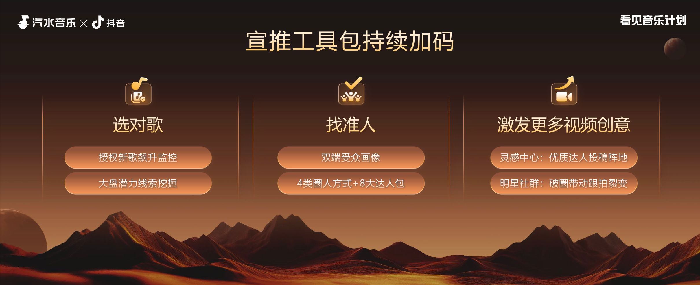 旧年9月抖音创作家大会上,抖音对平台的宣推才调作念了一次系统先容——“选对歌,找准东说念主,引发更多视频创意”,如今不到一年,这一宣发体系再次升级。