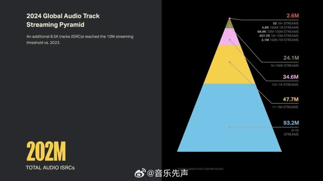 左证阛阓接洽机构Luminate发布的《2024年终音乐敷陈》自大,扬弃旧年年底,音频流媒体做事上有 2.02 亿首的安谧曲目,非凡于每月约150 万首、每天约5万首新歌上传到平台。